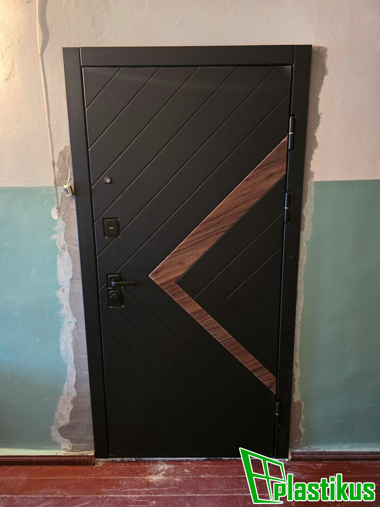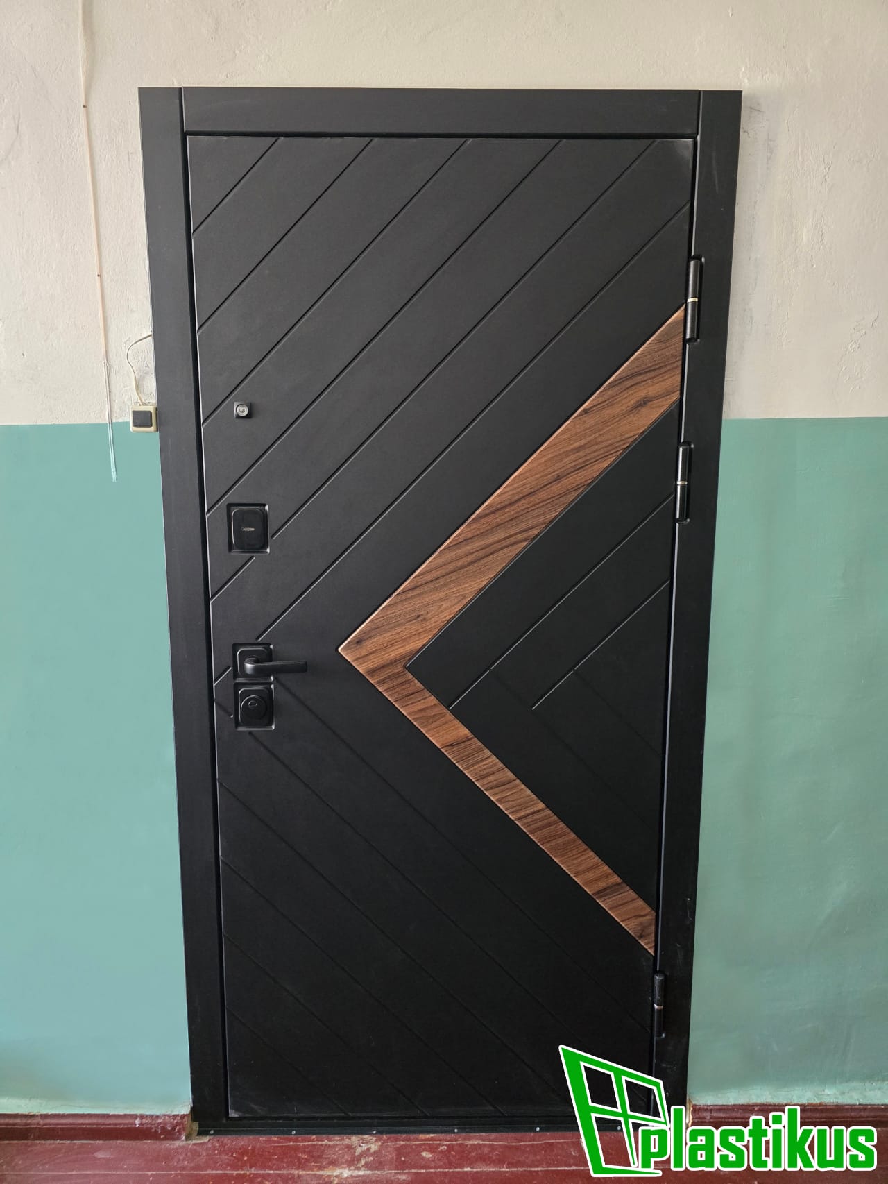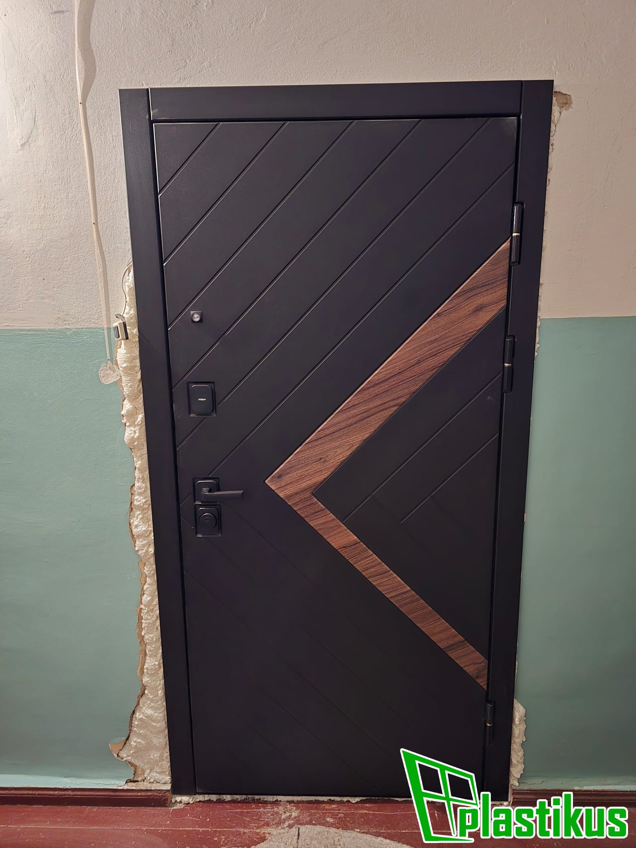 Цвет коричневый (RAL 8017), нажимной гарнитур коричневый + замок с ключем, заполнение - сендвичпанель 6 мм, откосы - МДФ панель + пластиковый угол под дерево
