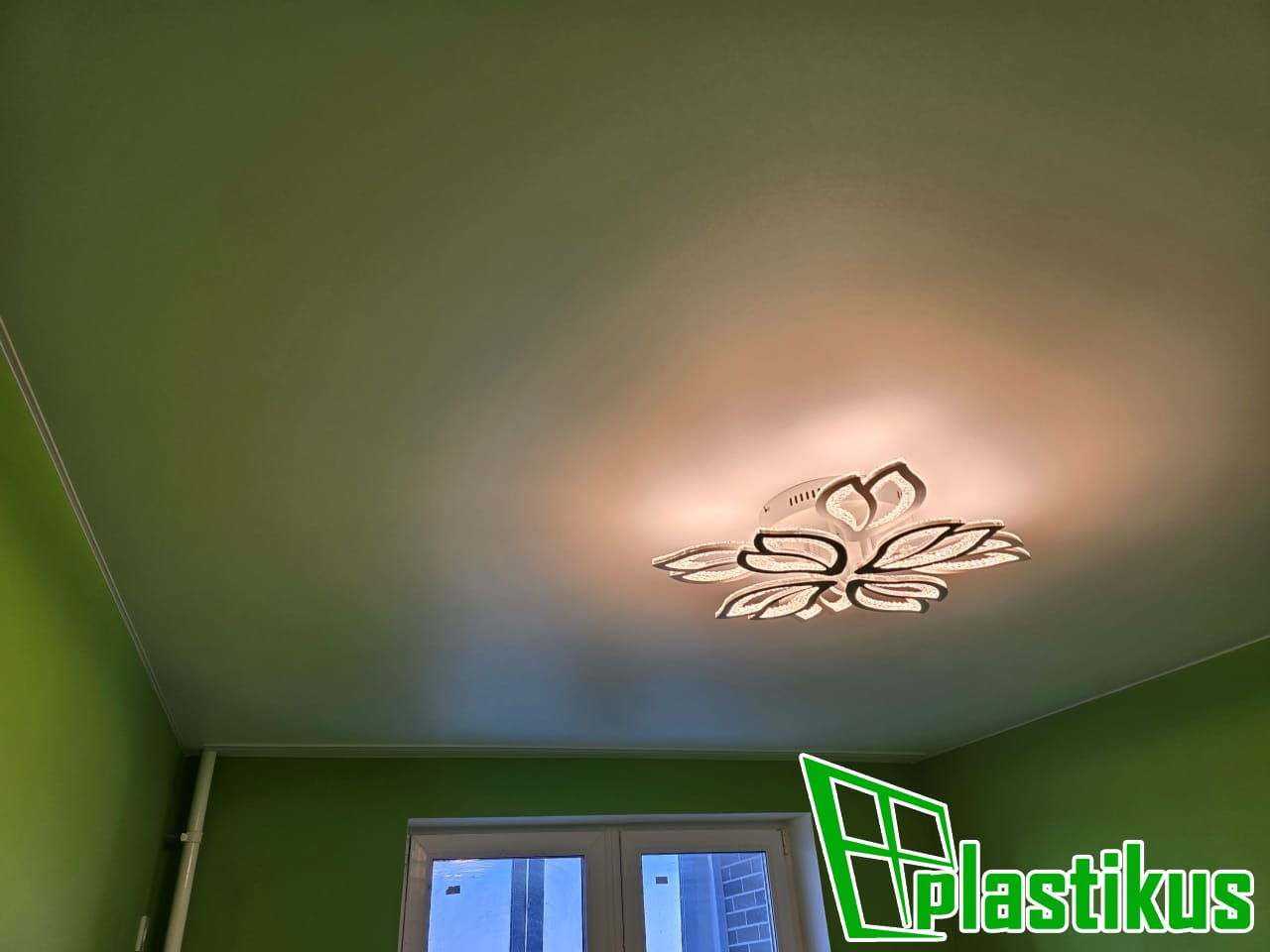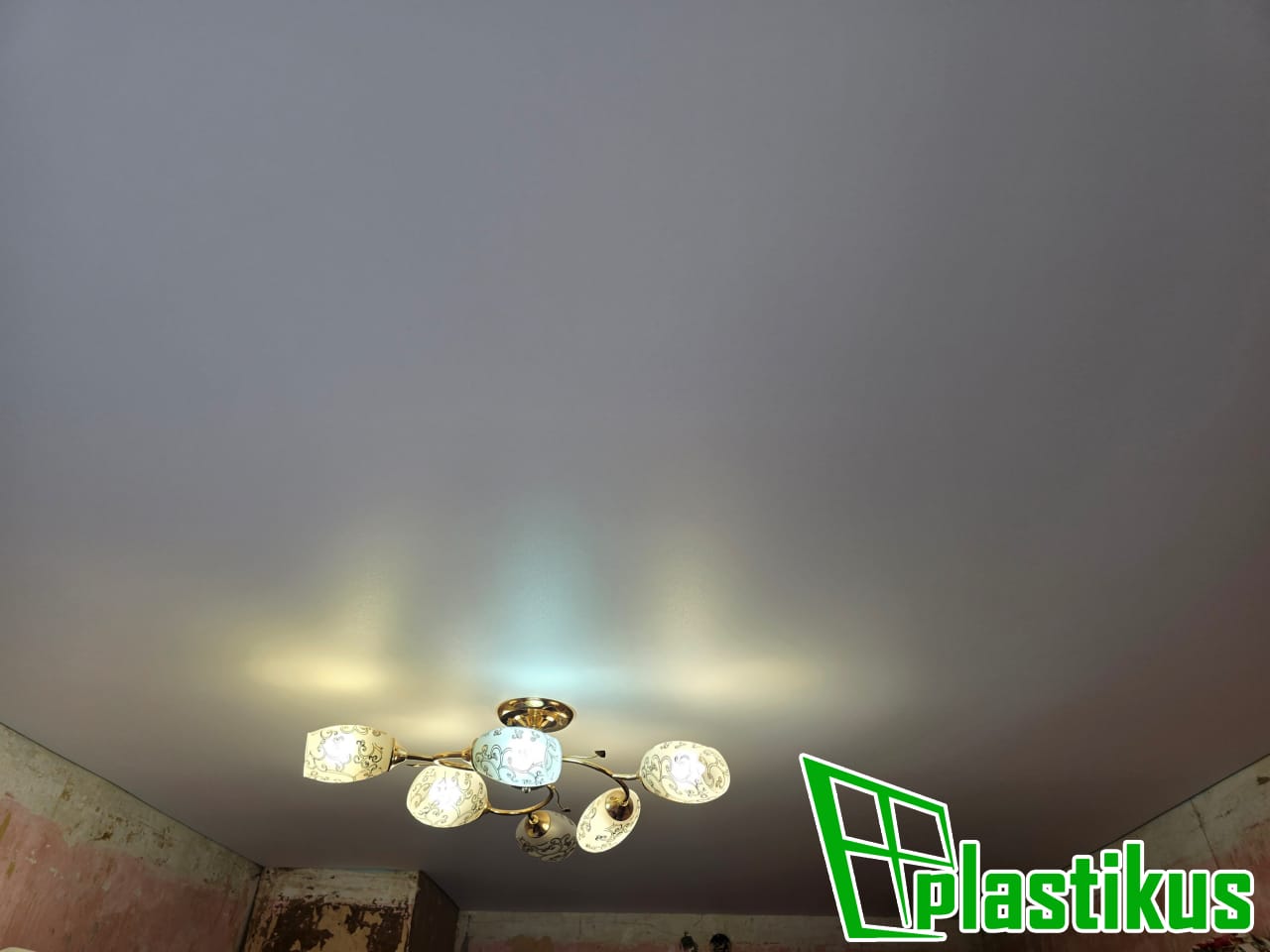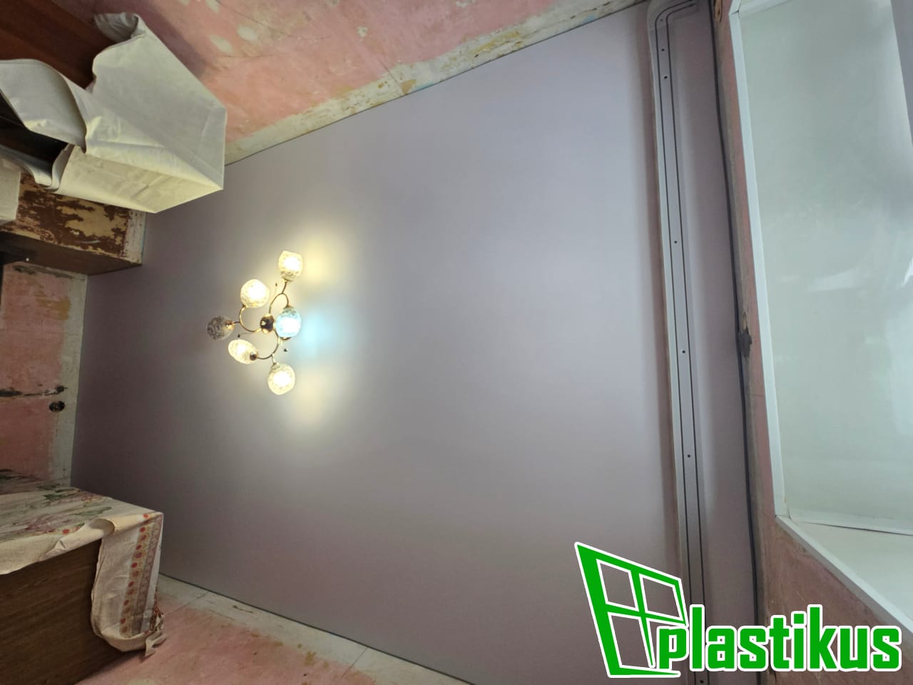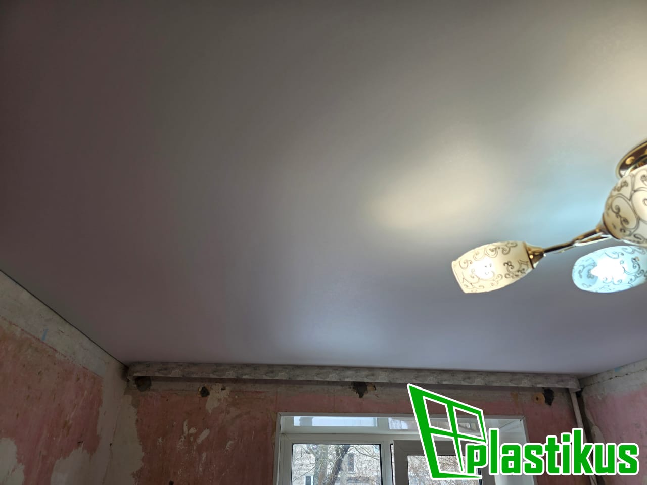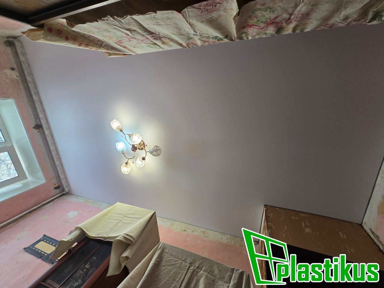 Полотно ПВХ бесшовное, белое, матовое. Обход трубы и внешнего угла. Установка люстры.