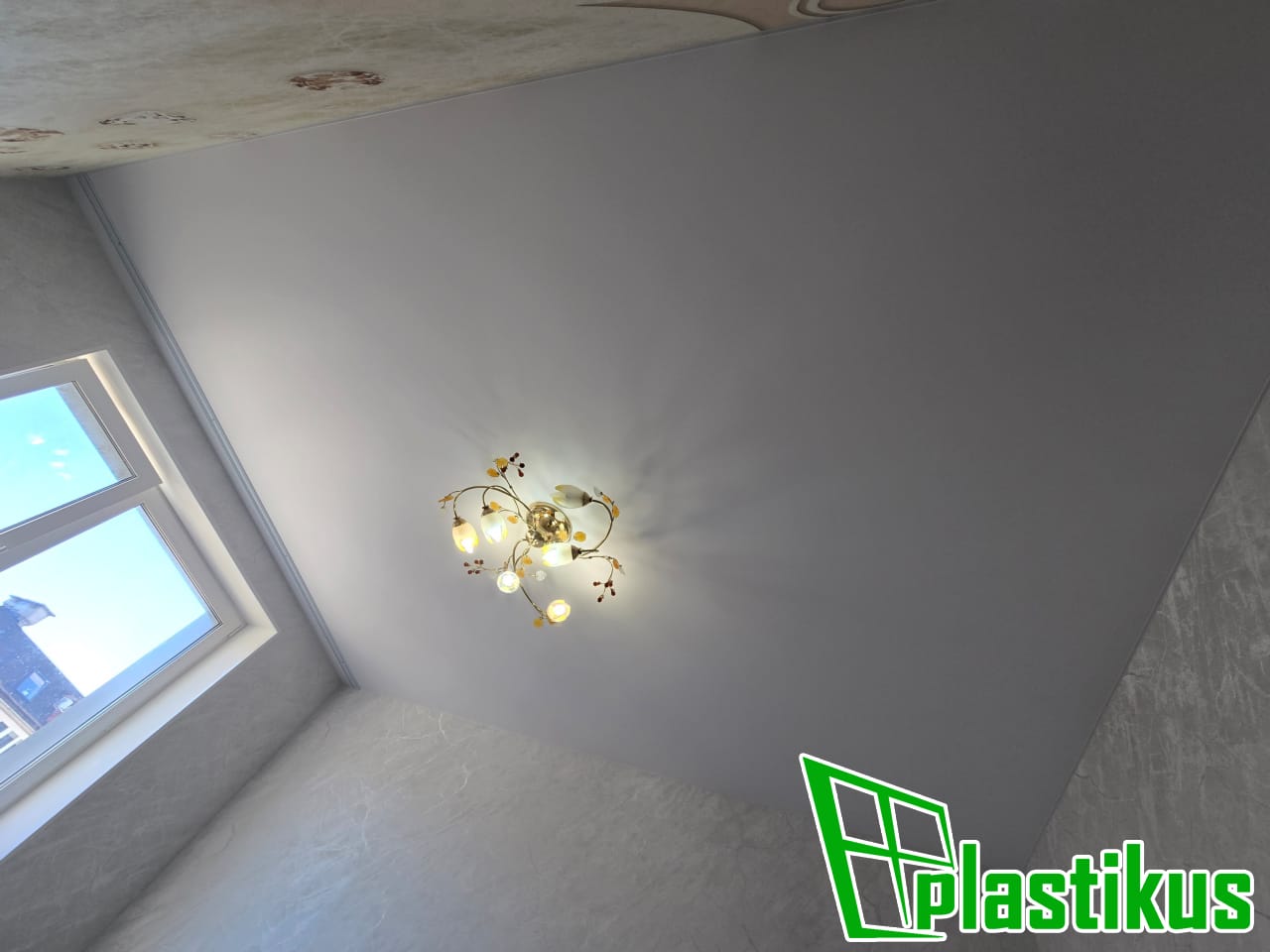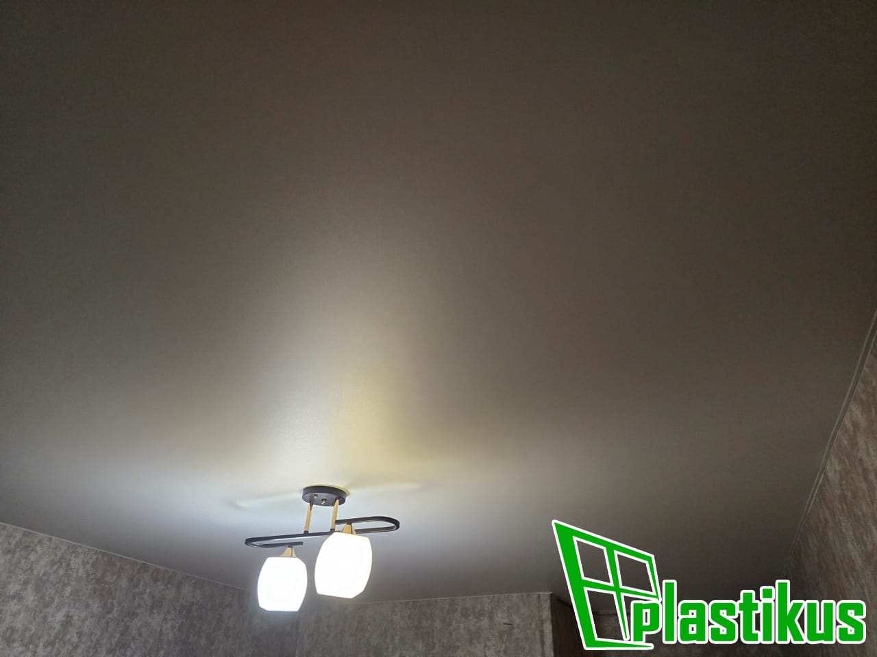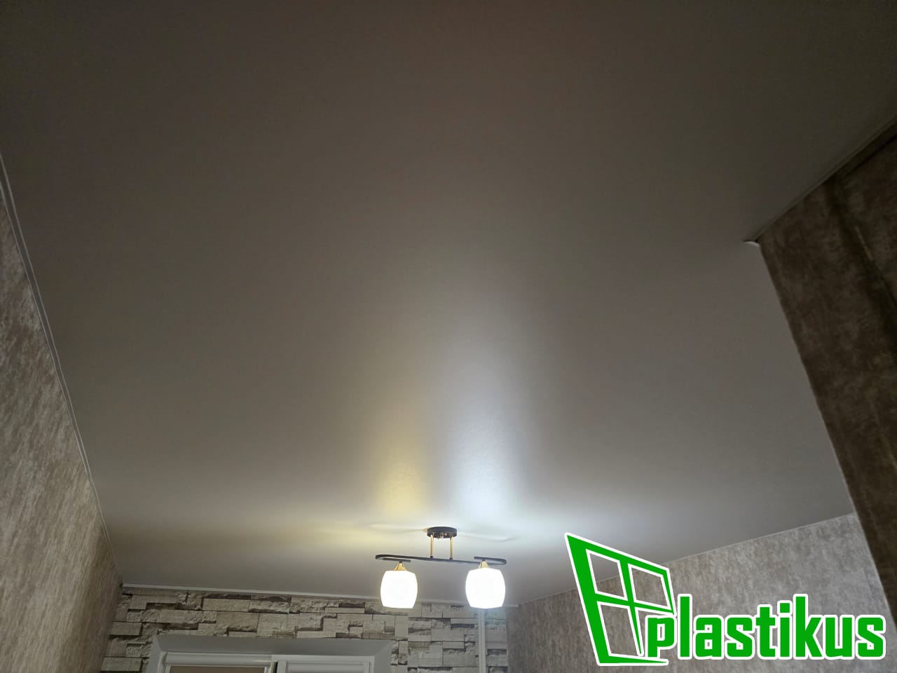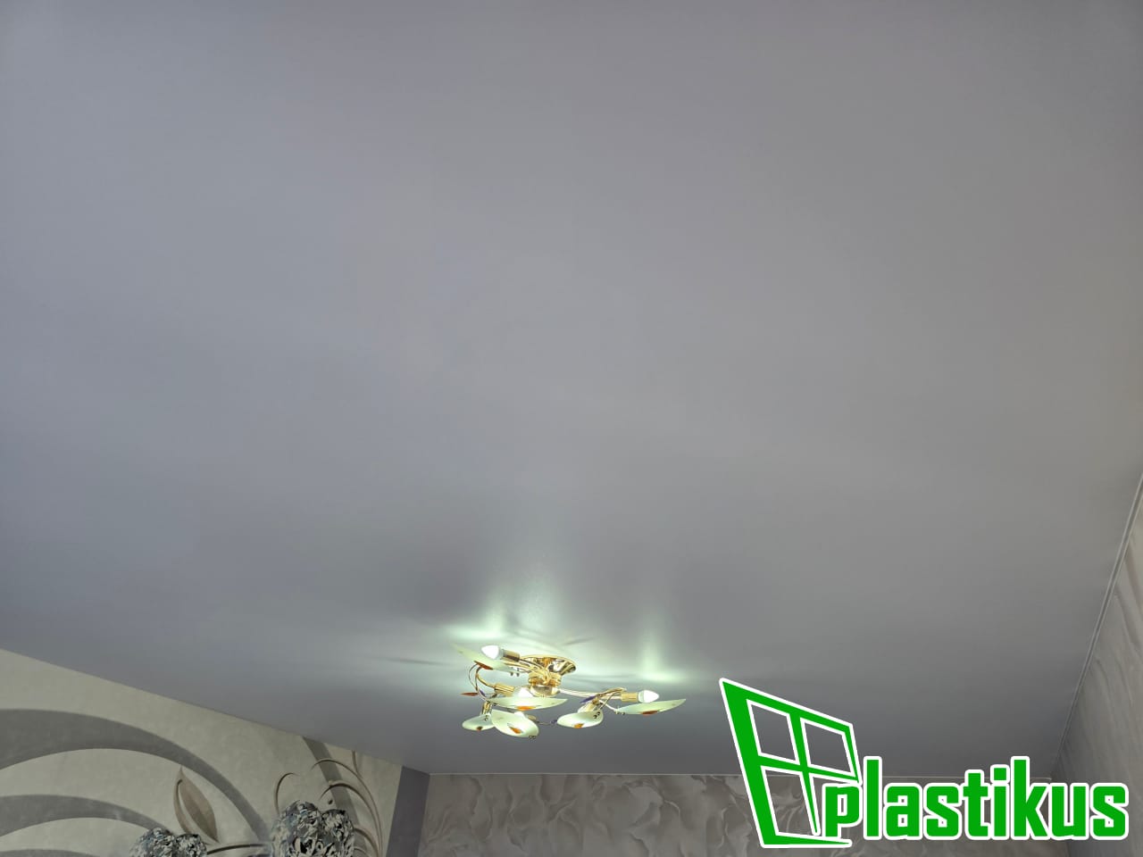 Полотно ПВХ бесшовное, белое, матовое. Обход трубы и внешнего угла. Установка люстры.