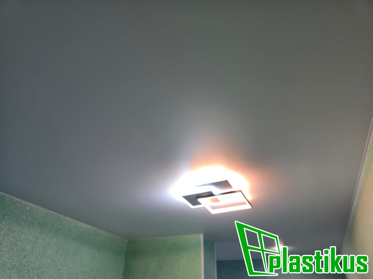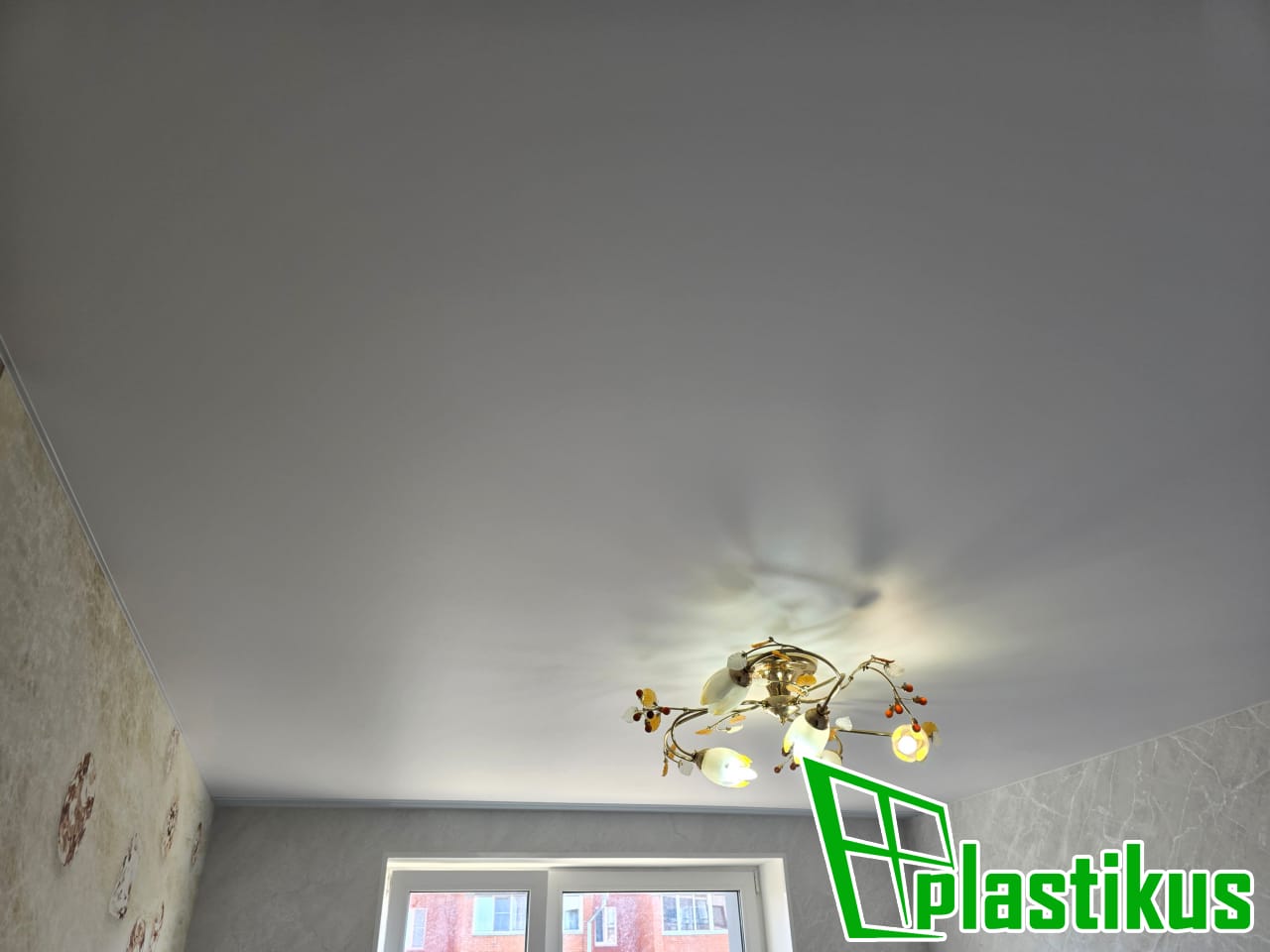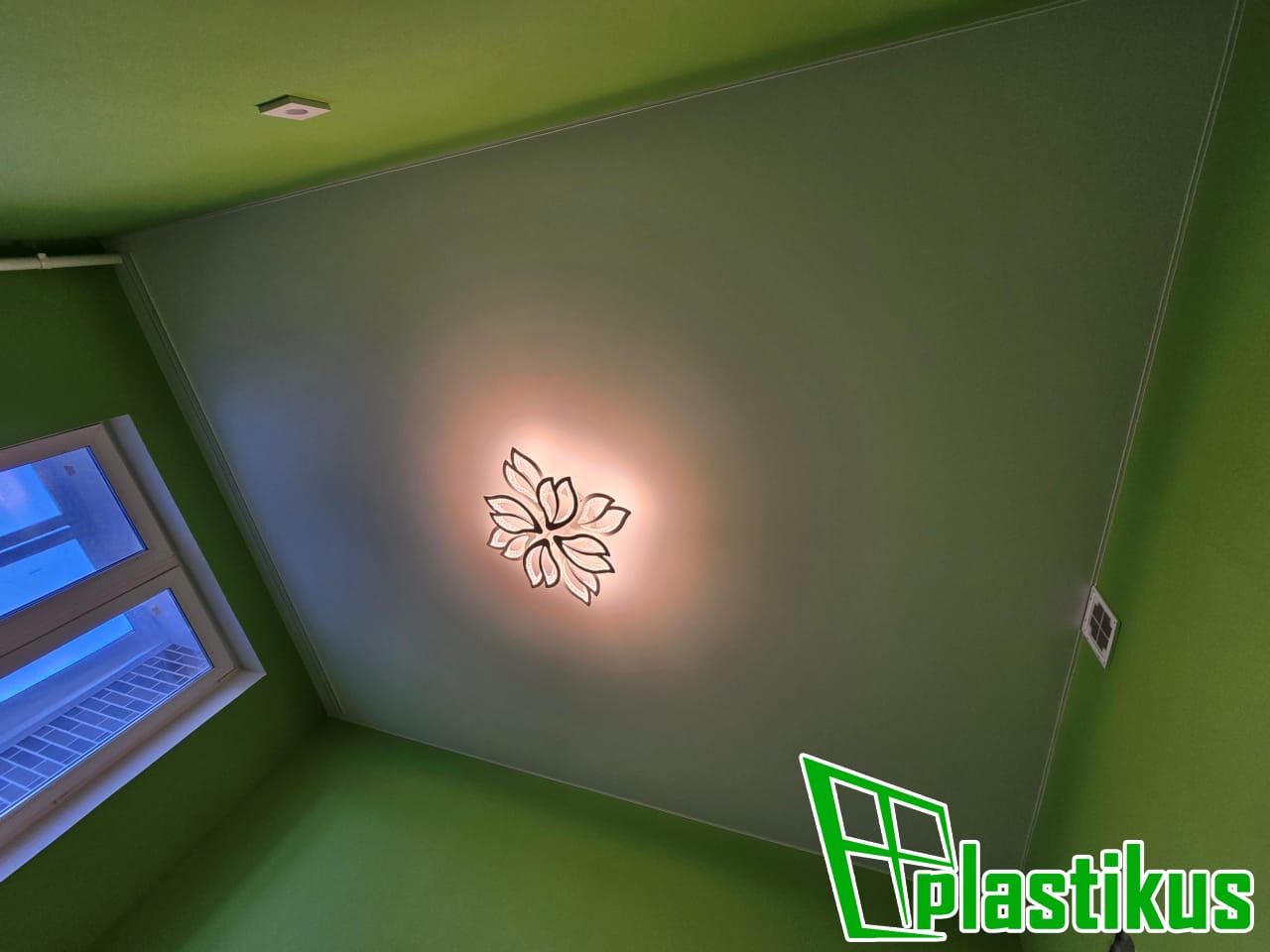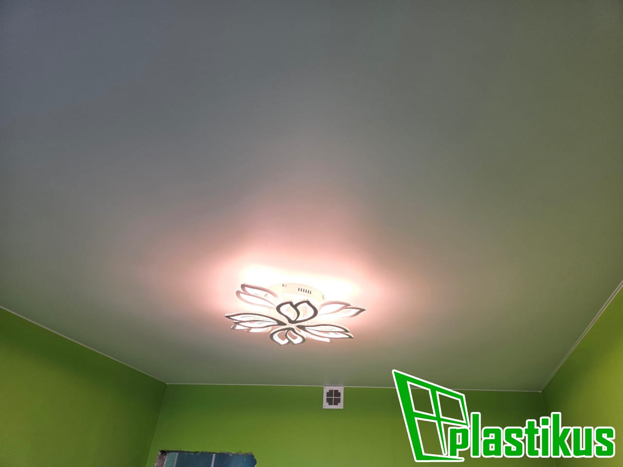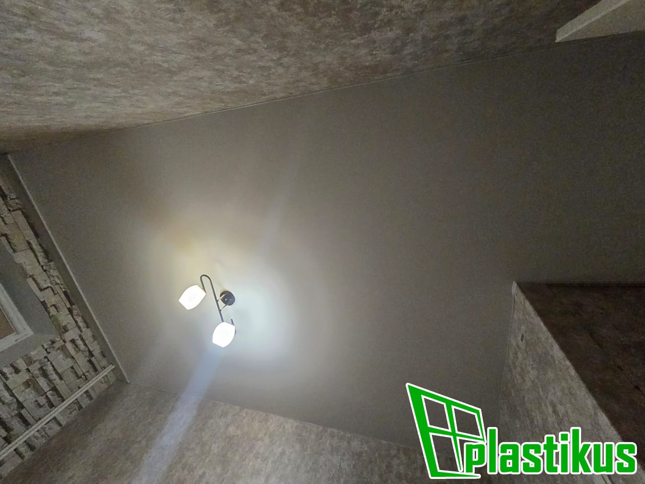 Полотно ПВХ бесшовное, белое, матовое. Обход трубы и внешнего угла. Установка люстры.