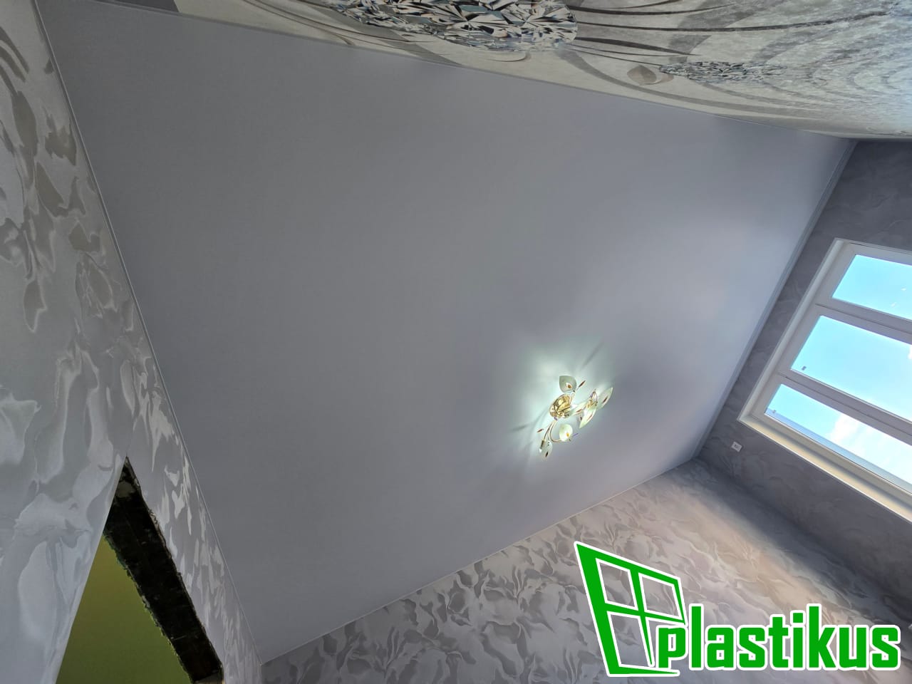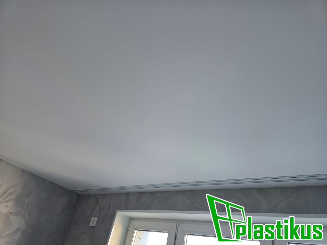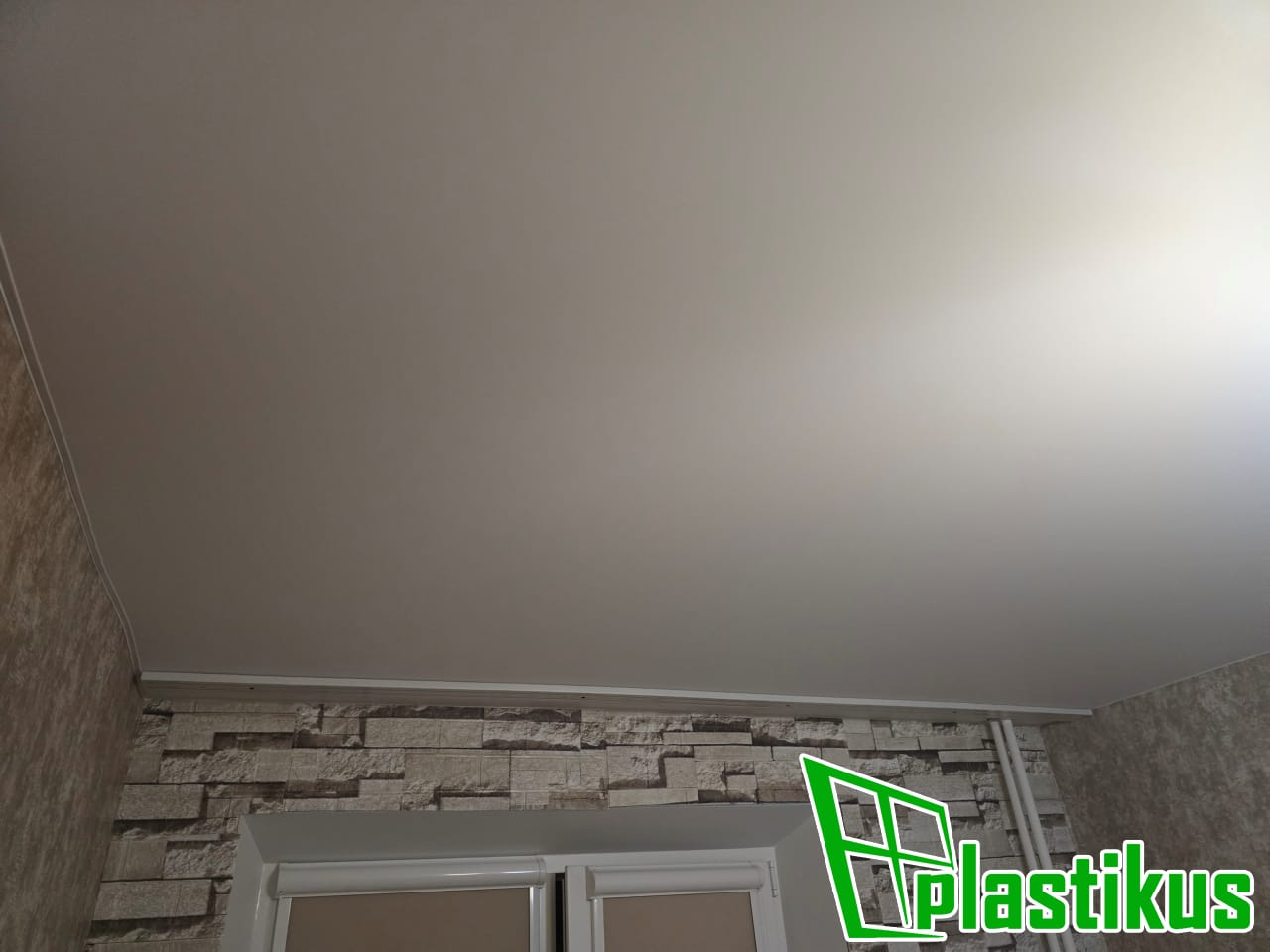 Полотно ПВХ бесшовное, белое, матовое. Установка люстры, гардины, обход трубы. Вставка не установлена, т.к. будут клеить обои.