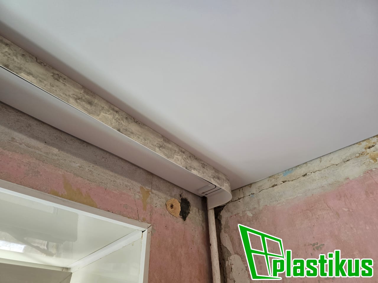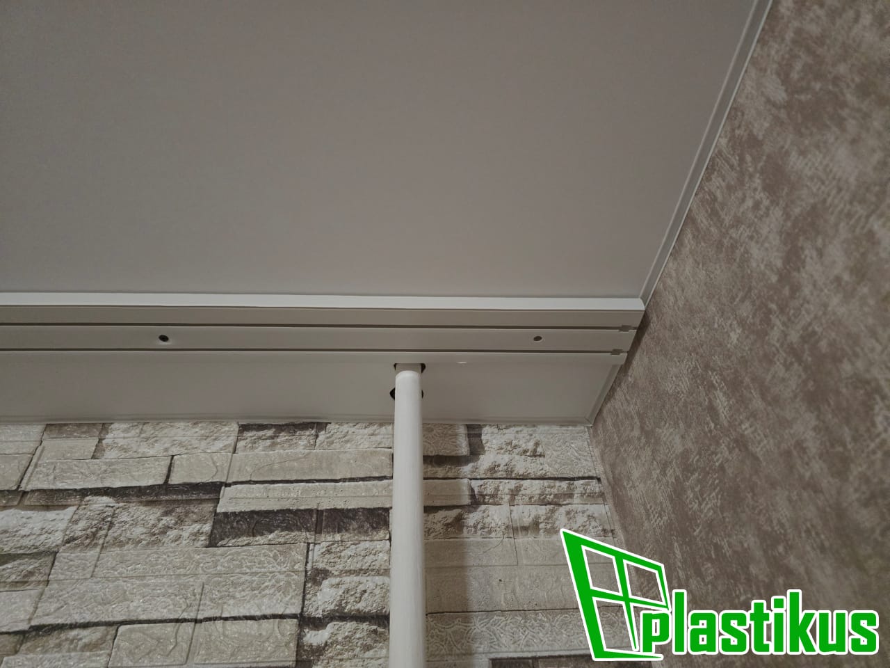 Гарпунная система. Белая вставка по периметру. Установка люстры. Обход трубы. Установка гардины.