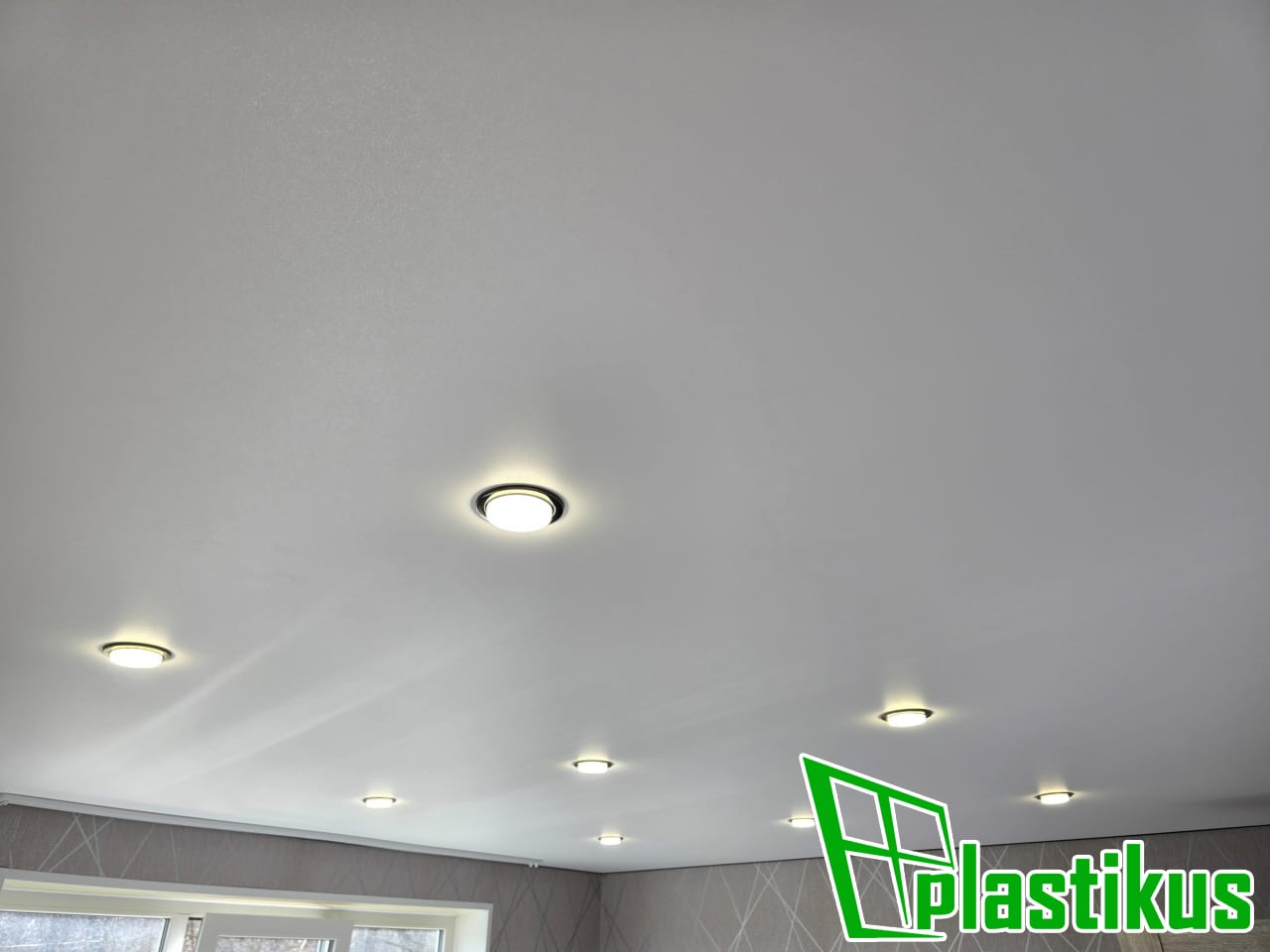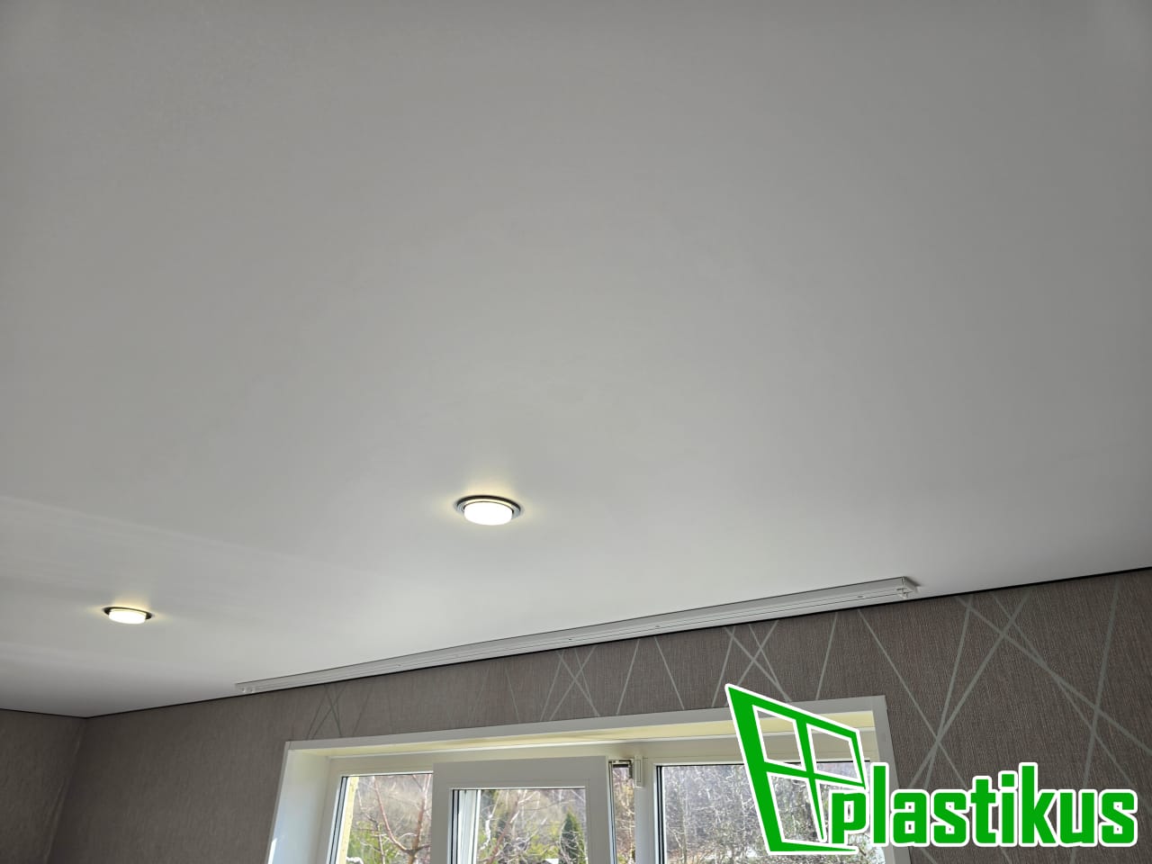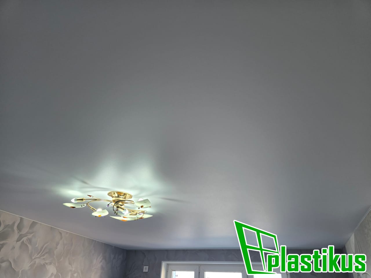 Полотно ПВХ бесшовное, белое, матовое. Установка люстры, гардины, установка встроенных светильников.