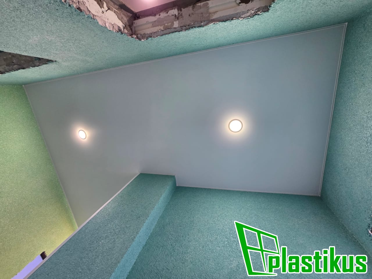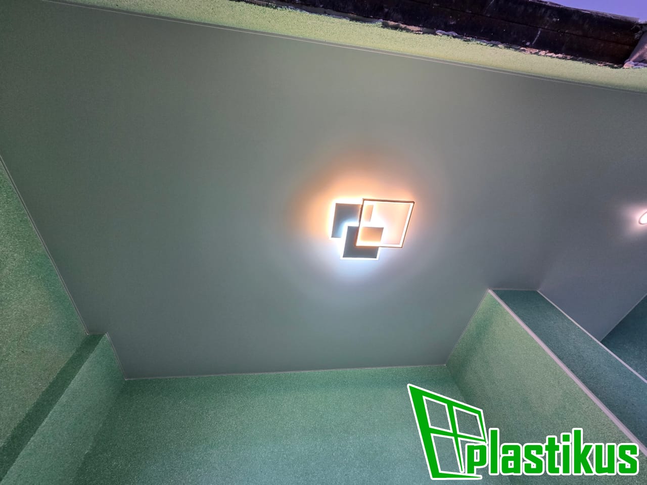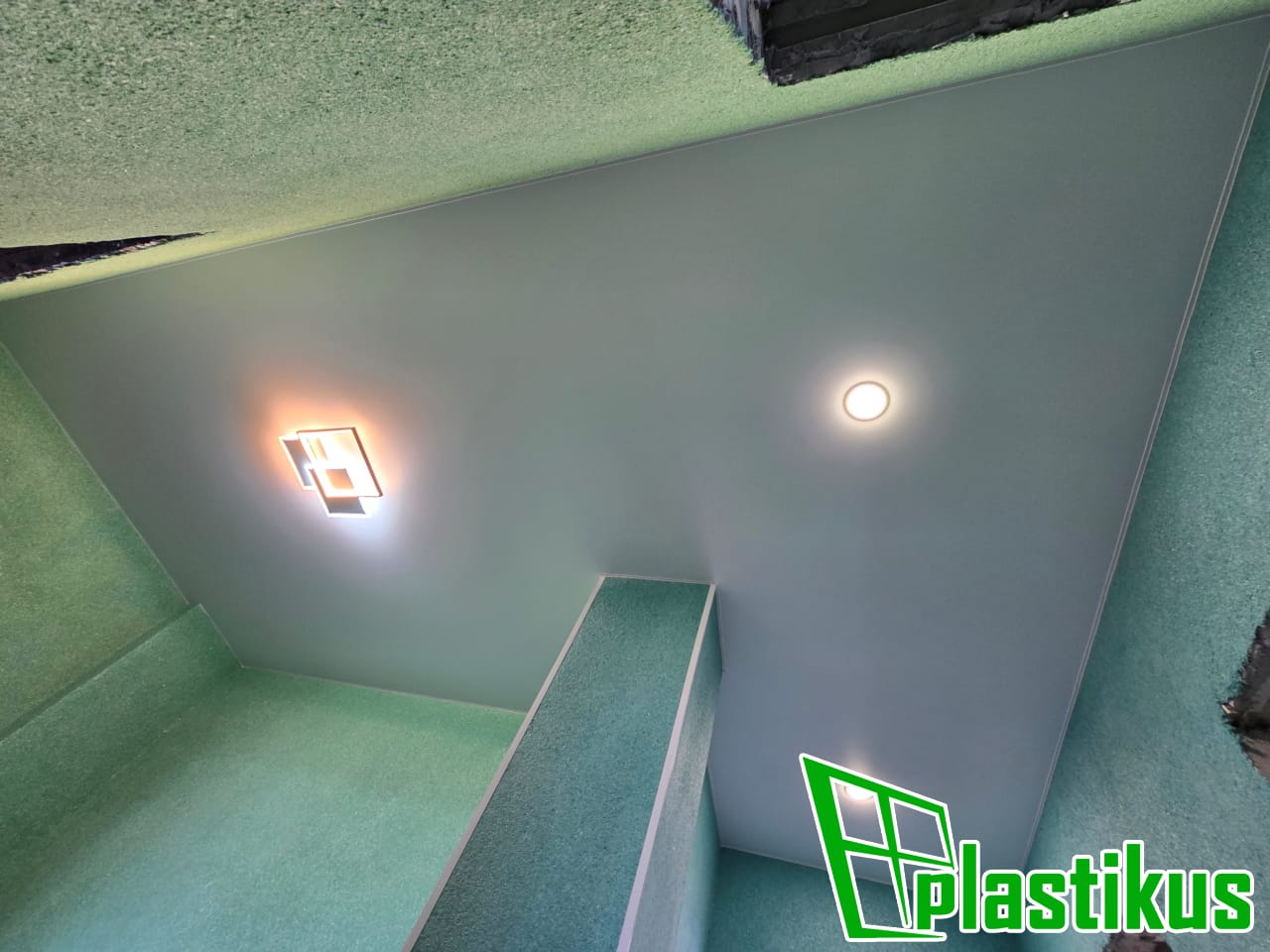 Полотно ПВХ бесшовное, белое, матовое. Обход лестничного марша. Установка встроенных светильников, закладных под люстры, датчика освещения, монтаж люка для электрооборудования. Вставка не установлена, т.к. будет широкий плинтус.