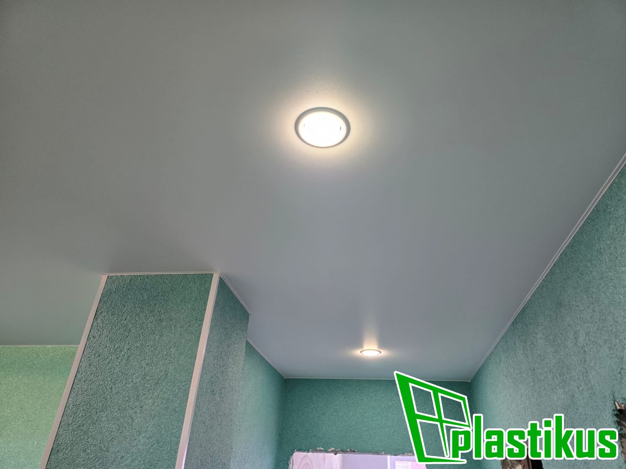 Гарпунная система. Установка встроенных светильников. Обходы труб и внешних углов. Вставка не установлена, т.к. будут клеить обои.