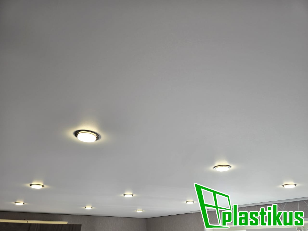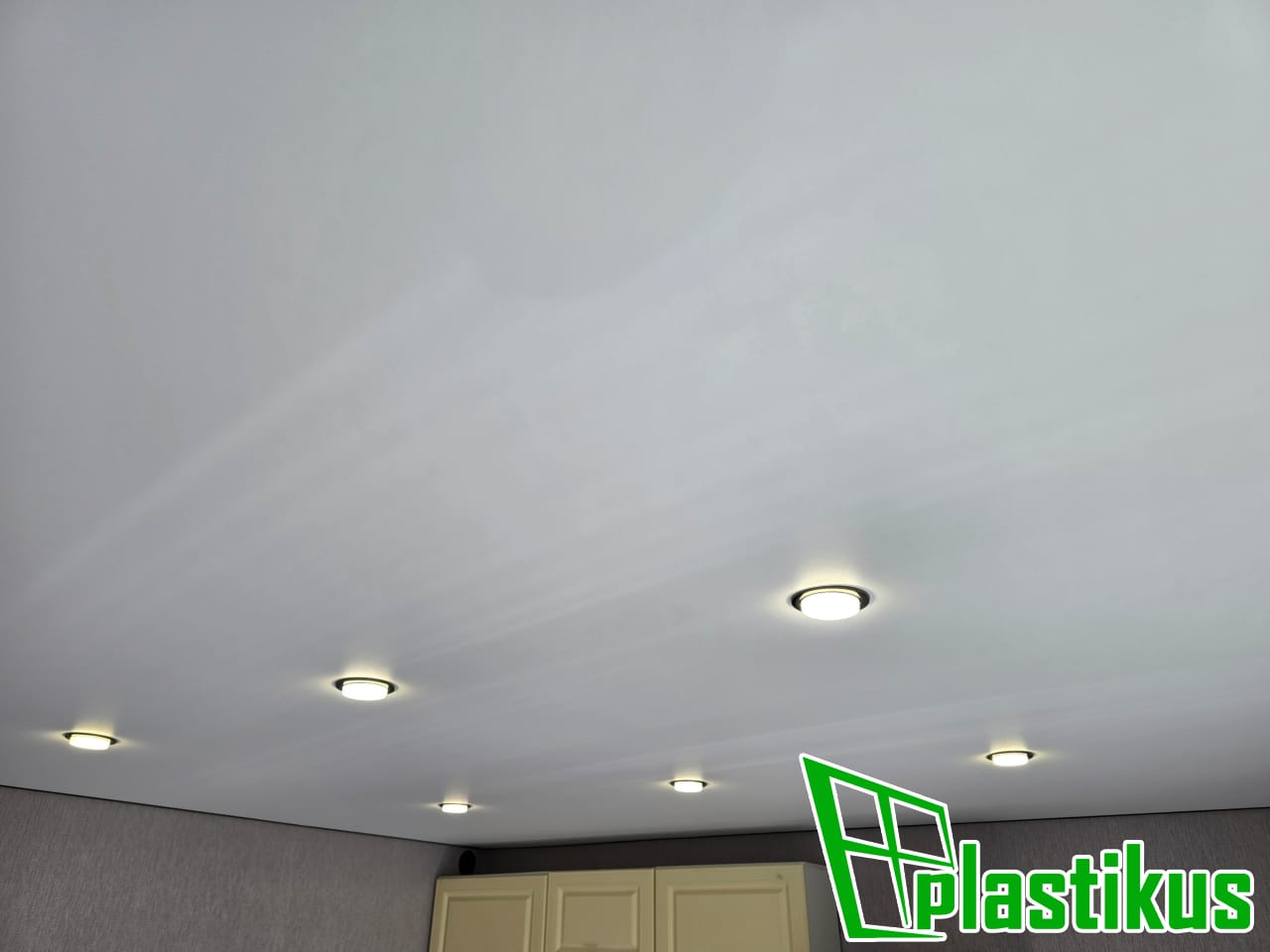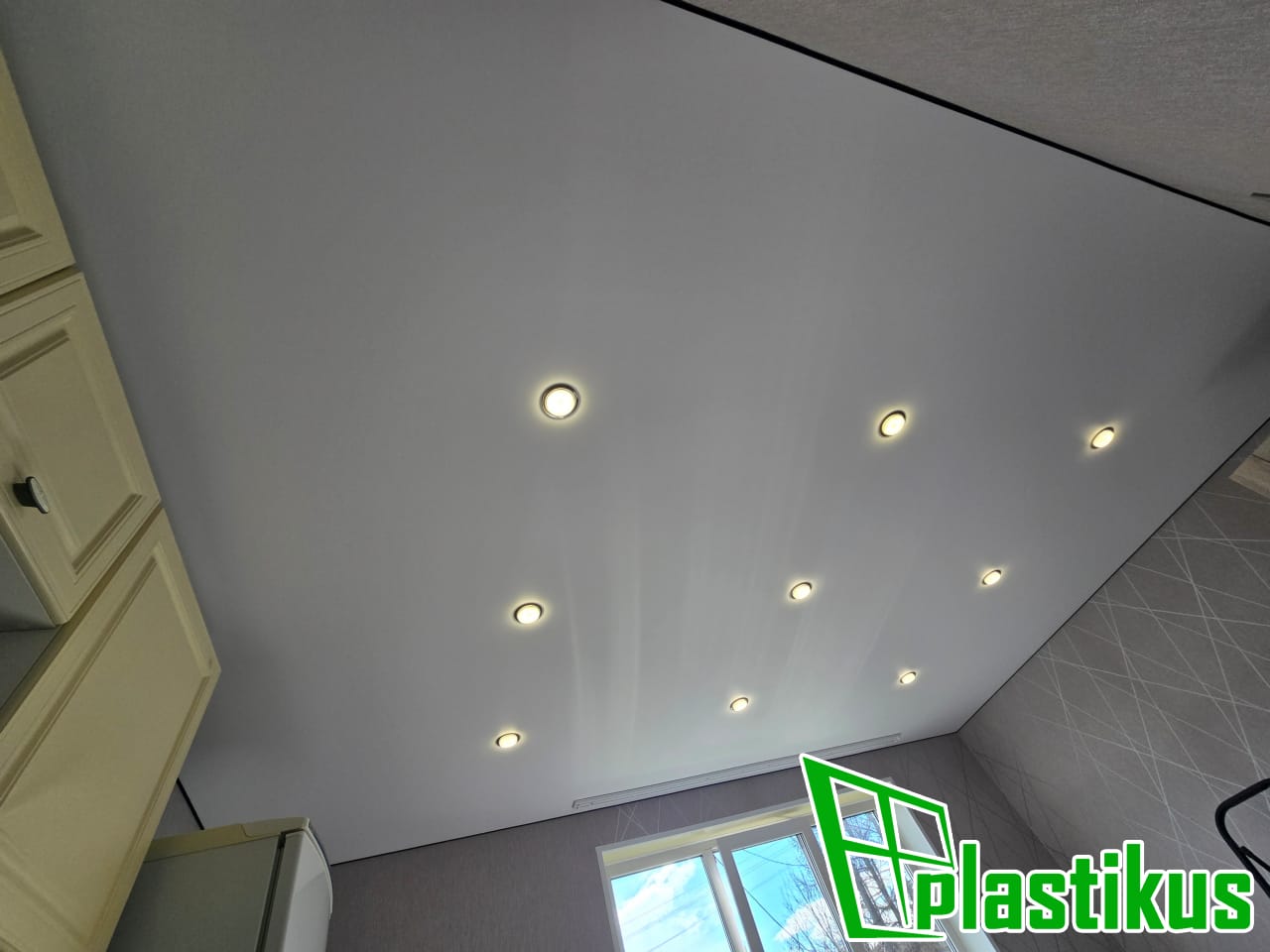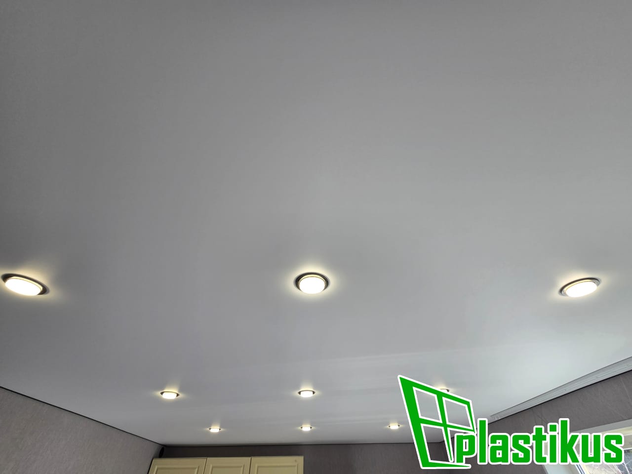 Полотно ПВХ бесшовное, белое, матовое. Установка закладных под люстры, установка встроенных светильников, установка скрытого вентилятора на вытяжку.